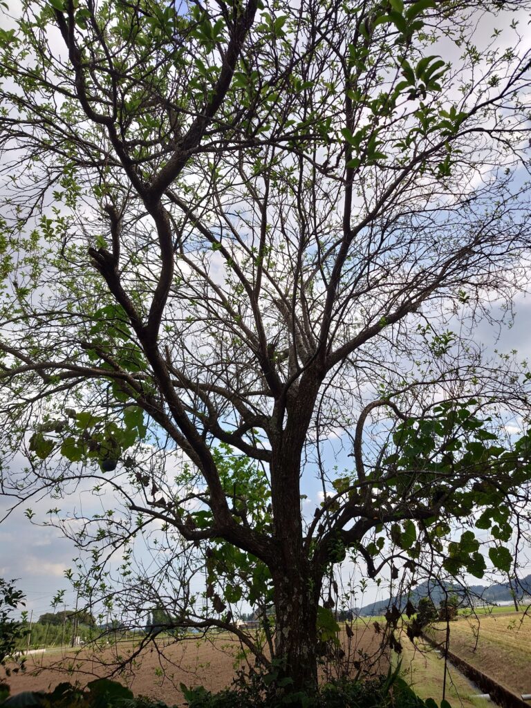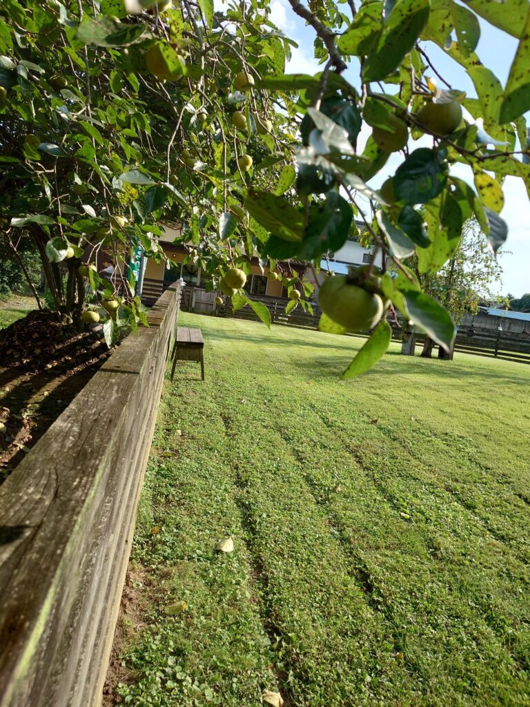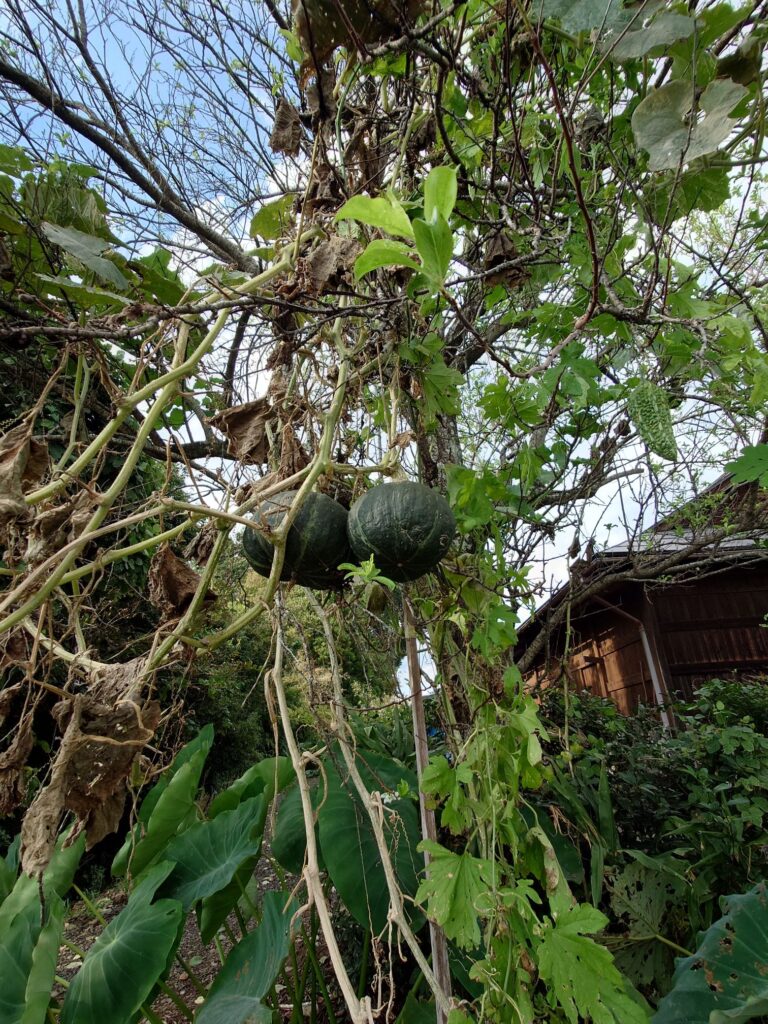 畑で栽培している「カボチャ」のつるが「すもも」の木に巻き付いて、「カボチャ」が木になっているように見えています。